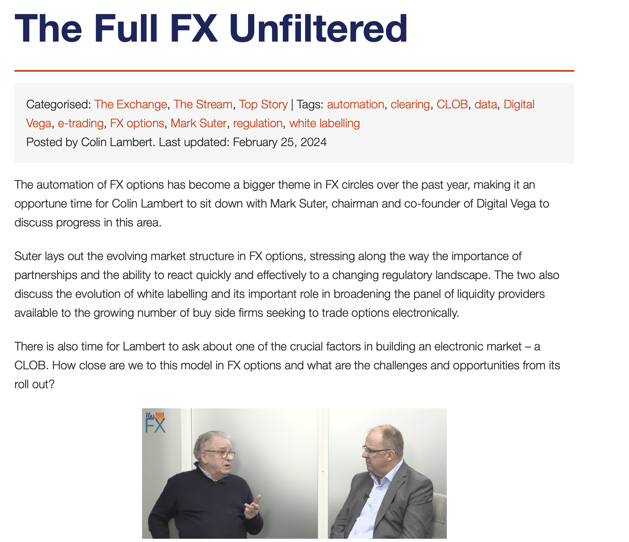 January 2025 - With FX options market structure changes continuing, Colin Lambert sits down with Mark Suter, executive chair of Digital Vega, which recently received investment from Citi, to discuss what was happening in the space. To read the full interview click here.